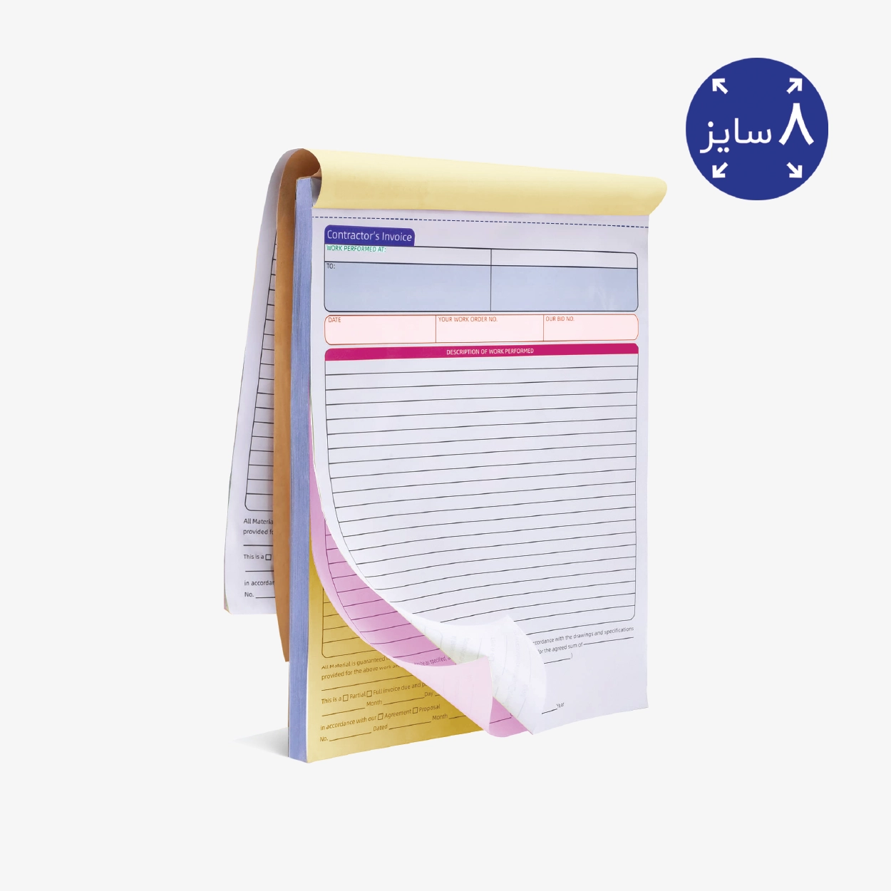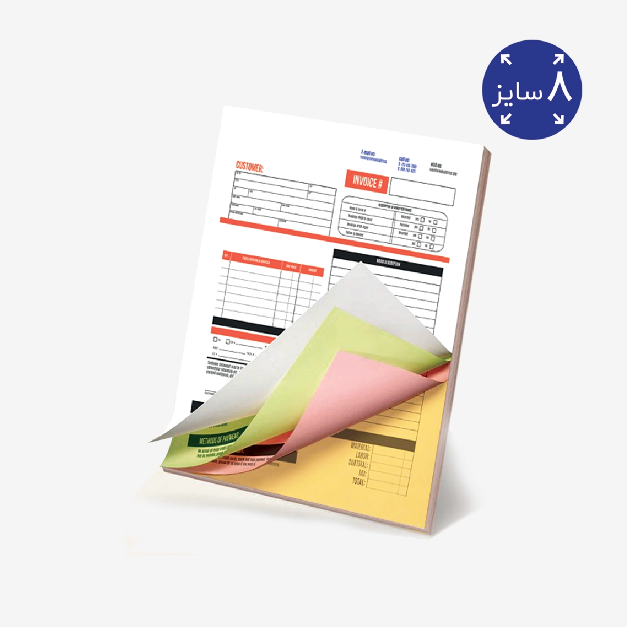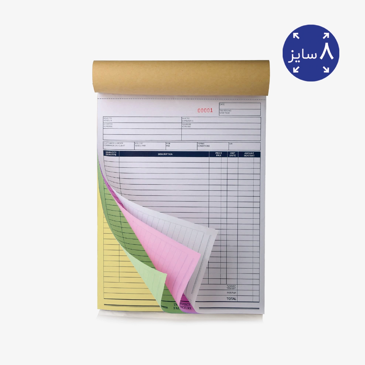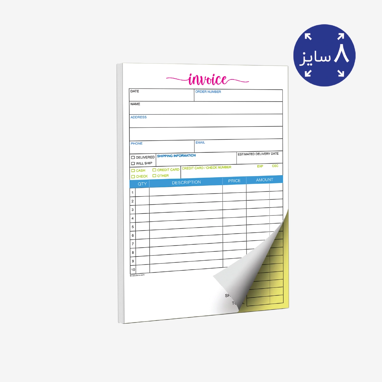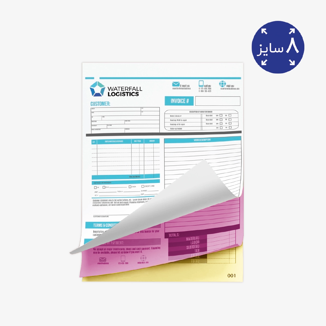 با استفاده از صحافی منگنهای و پرفراژ در بخش بالایی، فرمها بهصورت دستهای منظم نگهداری میشوند و در عین حال میتوان هر برگ را بهراحتی، بدون آسیب یا پارگی، جدا کرد. این ساختار باعث دوام بالای فرمها در استفاده روزمره و سهولت در تحویل برگه به مشتری یا بایگانی میشود. طراحی اختصاصی شامل لوگو، اطلاعات تماس و قالب دلخواه نیز قابل اجراست تا فاکتور شما با هویت برندتان هماهنگ باشد.